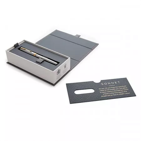 Plnicí pero Parker Sonnet Stainless Steel GT, hrot M. Tělo a víčko z broušené nerezové oceli. V kombinaci s doplňky pokovenými zlatem. Hrot z nerezové oceli s křížovou rytinou, pokovený zlatem.