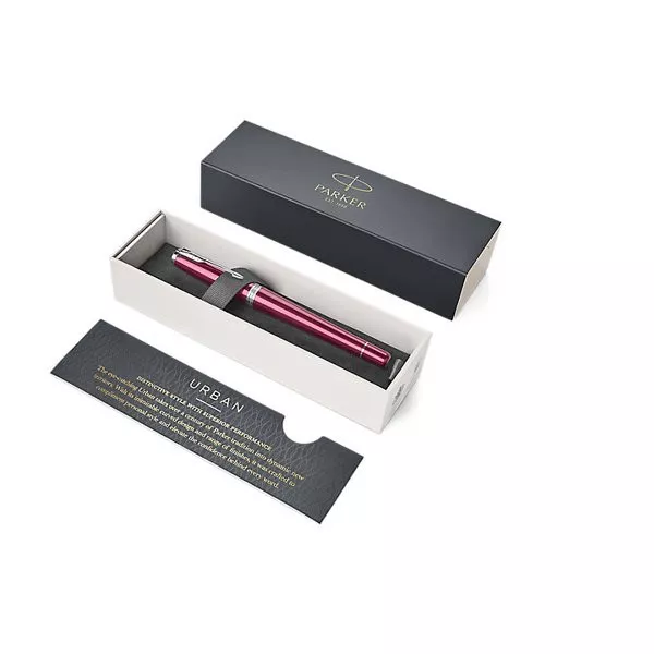 Plnicí pero Parker Urban Vibrant Magenta CT, hrot M. Broušené mosazné tělo a víčko s lakovanou povrchovou úpravou, černý plastový úchop. V kombinaci s doplňky pokovenými chromem. Hrot z ušlechtilé nerezové oceli.