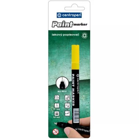 Popisovač Centropen 9211 lakový žlutý. Popisovač je určen pro psaní na diapozitivy, rentgenové snímky, gumy, kabely, kovy, CD, DVD a BD disky, keramiku, sklo, folie, plasty apod. Stopa písma je světlostálá, odolává vodě i při bodu varu, teplotě do 100°C, otěru i povětrnostním vlivům. Popisovač je osazen plastovým hrotem v kovové trubičce a přepouštěcím mechanismem. Šíře stopy 0,7 mm. Neobsahuje xylen.