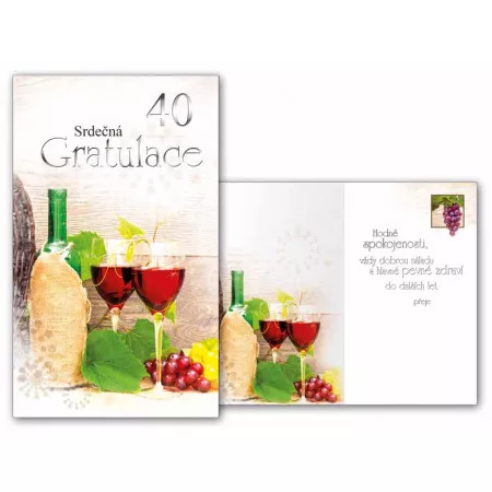 Přání MFP k narozeninám 40 M11 440 T. Přání ke 40. narozeninám s textem - Oslavy narozenin patří k výjimečným a příjemným okamžikům v životě. Potěšte oslavence a spolu s dárkem mu věnujte originální a krásné přáníčko, které mu bude připomínat tuto radostnou událost. Přání je s obrázkem vína. Text na přední straně přání: Na zdraví! 40. Text uvnitř přání: Na Tvé zdraví se dnes pije, do lesklých pohárků se víno lije. Cinkají skleničky a chodí známí, tisknou Ti ruku, říkají přání. Papír: pohlednicový karton 240 g. Přání je baleno v sáčku, součástí balení je i dopisní obálka.