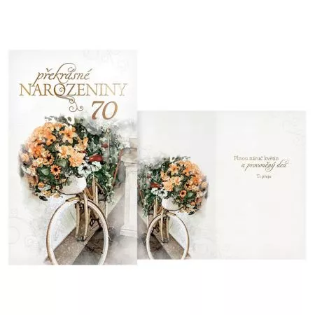 Přání MFP k narozeninám 70 M11-512 T s textem. Přání ke 70. narozeninám s textem - Oslavy narozenin patří k výjimečným a příjemným okamžikům v životě. Potěšte oslavence a spolu s dárkem mu věnujte originální a krásné přáníčko, které mu bude připomínat tuto radostnou událost. Text na přední straně přání: všechno nejlepší 70. Text uvnitř přání: Plný košík něžných květů, z nich Ti přání dneska spletu.Papír: pohlednicový karton 240 g. Přání je baleno v sáčku, součástí balení je i dopisní obálka.
