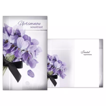 Přání MFP kondolenční M13 063 T. Úmrtí blízké osoby je vždy tragická událost. Vyjádřete kondolencí upřímnou soustrast a soucit pozůstalým. Kondolenční přání a smuteční květiny Vám zajistí důstojné rozloučení s vaším blízkým člověkem. Přání je s obrázkem fialek obvázaných černou stužkou. Text na přední straně přání: Upřímnou soustrast. Text uvnitř přání: Smutně vzpomínáme. Papír: pohlednicový karton 240 g. Přání je baleno v sáčku, součástí balení je i dopisní obálka.