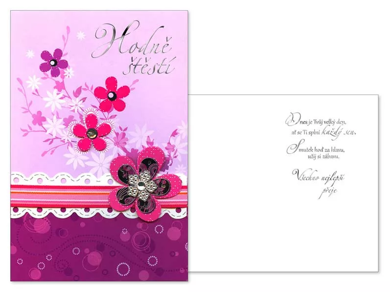 Přání MFP srdečné CN 393. Srdečné přání k narozeninám nebo svátku s textem. Aby vše bylo dokonalé nezapoměňte k dárku koupit i přání. Text na přední straně přání: Hodně štěstí. Text uvnitř přání: Dnes je Tvůj velký den, ať se Ti splní každý sen. Smutek hoď za hlavu, užij si zábavu. Všechno nejlepší přeje. Papír: pohlednicový karton 240 g. Přání je baleno v sáčku, součástí balení je i dopisní obálka.
