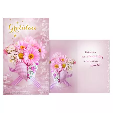 Přání MFP srdečné malé M18-232 Z s textem. Srdečné přání malé k narozeninám s textem a obrázkem květin. Nezapomeňte k dárku k narozeninám koupit i pěkné přáníčko. Uděláte oslavenci určitě velkou radost. Text na přední straně přání: Gratulace. Text uvnitř přání: Přejeme jen samé slunné dny a vše, co přináší radost.