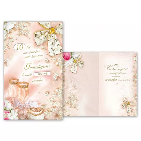 Přání MFP svatební otočné M16 099 W. Přání k výročí svatby s textem - Svatba je příjemná a mimořádná událost a je začátkem nové etapy života. Udělejte radost manželům a věnujte jim přání , jako vzpomínku k jejich svazku, díky kterému si vždy připomenou krásné začátky jejich manželství. Nápis je vyrytý zlatým písmem a přání zdobí svatební motivy. Příklad textu na přední straně přání: 10 let na společné cestě životem. Gratulujeme k vaší růžové svatbě. Text uvnitř přání: Všechno nejlepší k Vašemu výročí svatby a ještě mnoho krásných společných let přeje. Papír: pohlednicový karton 240 g. Uvedená cena je za 1 ks. Přání je baleno v sáčku. Součástí přání je i obálka.