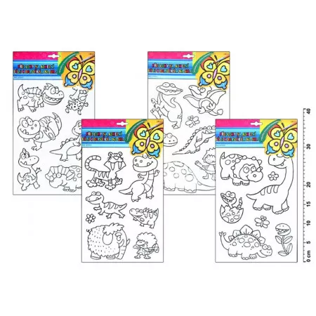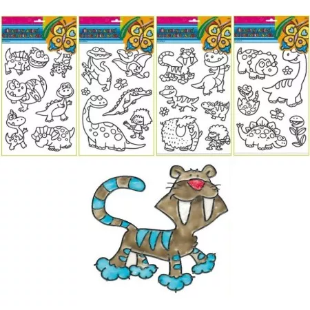 Předloha k barvám na sklo ANDĚL 1534 vyvýšená kontura. Předlohy pro malování na sklo, s vyvýšenou konturou, na adhezní fólii, s veselými motivy pravěkých zvířat. Obrázek se po vybarvení a uschnutí umístí na čisté sklo nebo jinou hladkou plochu, obrázek jednoduše elektrostaticky přilne. Uvedená cena za jedno balení, motiv dle skladových zásob.