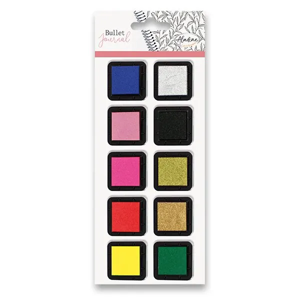 Razítkovací inkoustové polštářky k diářovým razítkům Aladine. Sada obsahuje 10 ks barevných rychleschnoucích inkoustových polštářků v základních barvách. Metalické odstíny (zlatá, stříbrná) schnou 30 minut.