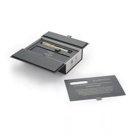 Roller Parker Royal Duofold Classic Ivory & Black GT. Tělo a víčko z houževnaté pryskyřice ve slonovinové barvě, doplněné černými prvky. V kombinaci s doplňky pokovenými 23karátovým zlatem. Včetně individuálního sériového čísla.