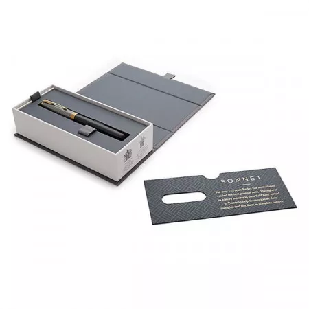 Roller Parker Sonnet Silver & Black GT. Černě lakované tělo, víčko z mincovního stříbra (ryzost Ag 925/1000) pokryté ochranným lakem a se zdobnými rytinami vyplněnými černou pryskyřicí. V kombinaci s doplňky pokovenými 23karátovým zlatem.