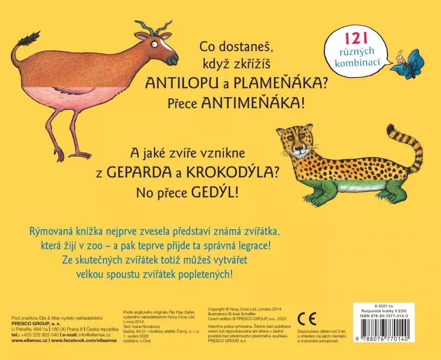 Rýmovaná knížka nejprve představí zvířátka, která žijí v zoologických zahradách – a pak teprve přijde ta správná legrace! Ze skutečných zvířátek totiž můžete vytvářet velkou spoustu zvířátek popletených! Jejich novými neobyčejnými vlastnostmi a roztodivnými jmény se budou bavit nejen malí čtenáři, ale s chutí se nad nimi zasmějí i ti dospělí. Věřili byste, že do jedné malé knížky se vejde o pár desítek více než stovka různých tvorů? Veselé ilustrace mezinárodně oceňovaného autora jsou doplněné původními českými básničkami.