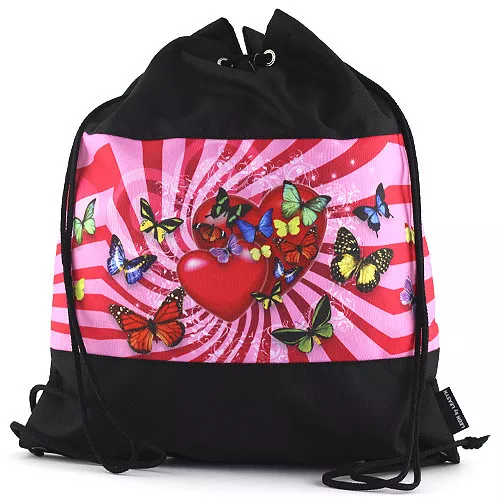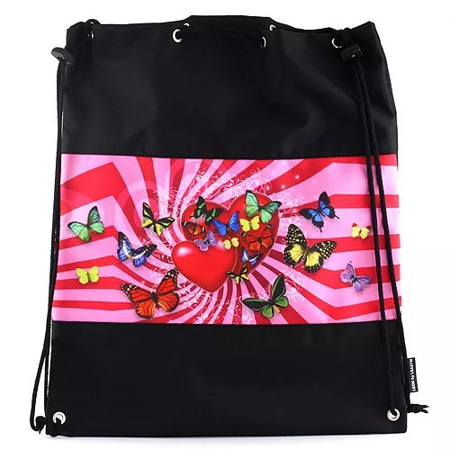 Sáček na cvičky Leasyn, srdíčka a motýlci. Perfektně zpracovaný sáček na cvičky vyrobený z odolného textilního materiálu s efektním potiskem zaručuje minimální opotřebení a dlouhou životnost. Stylový a zároveň praktický pomocník na cesty, sport, obuv i pro běžné nošení.