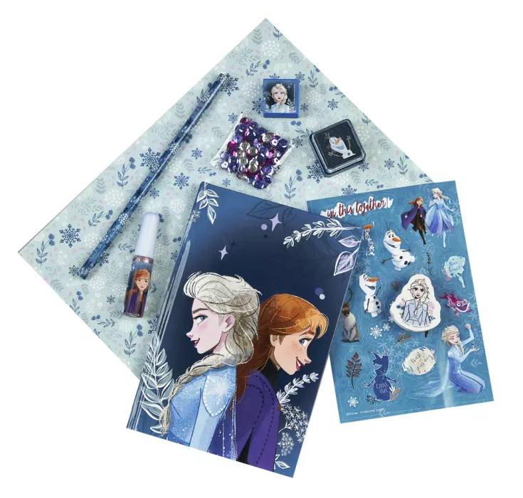 Sada zápisníků Frozen. Kreativní sada s motivem Ledového království obsahuje zápisník (vel. 12 x 18 cm), 60 listů. Dále jsou součástí sady flitry ve 2 barvách, třpytivé lepidlo, razítko, razítkovací polštářek, tužka s gumou navrchu a aršík samolepek.