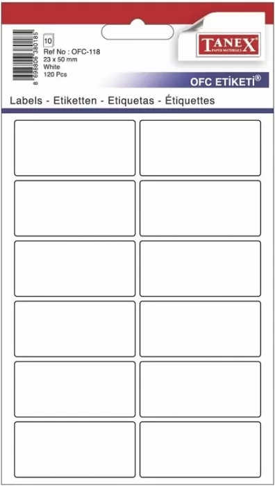 Samolepící etikety v sáčku 23x50 mm, 120 etiket v balíčku OFC-118. Etikety jsou baleny po 10 aršících v sáčku, Cena za 1 balení.