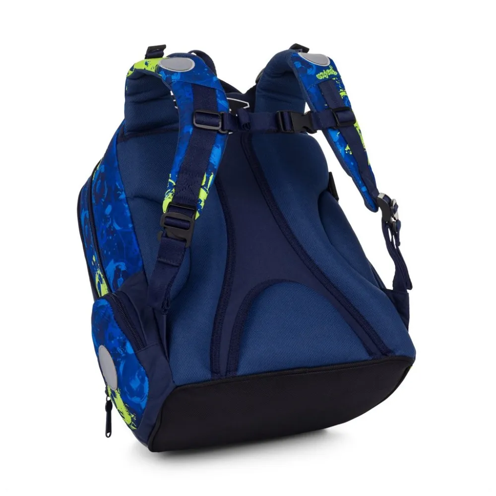 Školní batoh OXY GO zaujme moderním designem a promyšlenou funkčností. Má anatomicky tvarovaná, prodyšná záda a nastavitelné ramenní popruhy pro pohodlné nošení. Přidané háčky umožňují uchycení dlouhých popruhů. Vnitřní kapsy nabízí dostatek místa na učebnice, sešity i další potřeby, pevné nepromokavé dno chrání obsah před ušpiněním a protečením. Boční kapsy, jedna na zip a jedna otevřená, slouží např. na láhev. Reflexní prvky zajišťují bezpečnost. Batoh je ideální pro děti od 1. do 3. třídy vysoké od 125 cm. Délka zádového panelu je 39 cm, objem 22 l, hmotnost 930 g, nosnost 8 kg. Sáček: Praktický na cvičky nebo volnočasové aktivity, uzavírá se šňůrkami. Penál: Jednopatrový se dvěma chlopněmi, poutka na psací potřeby a průhledná fólie na rozvrh hodin.
