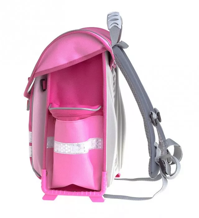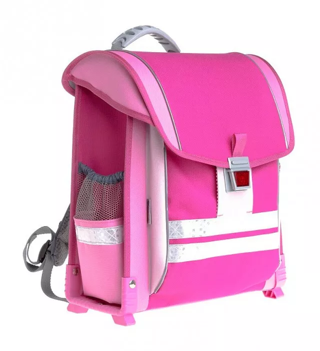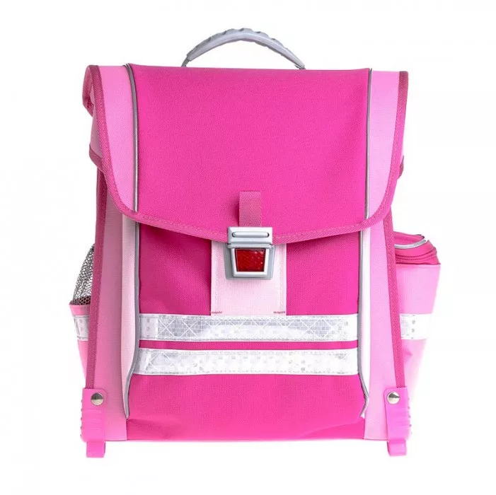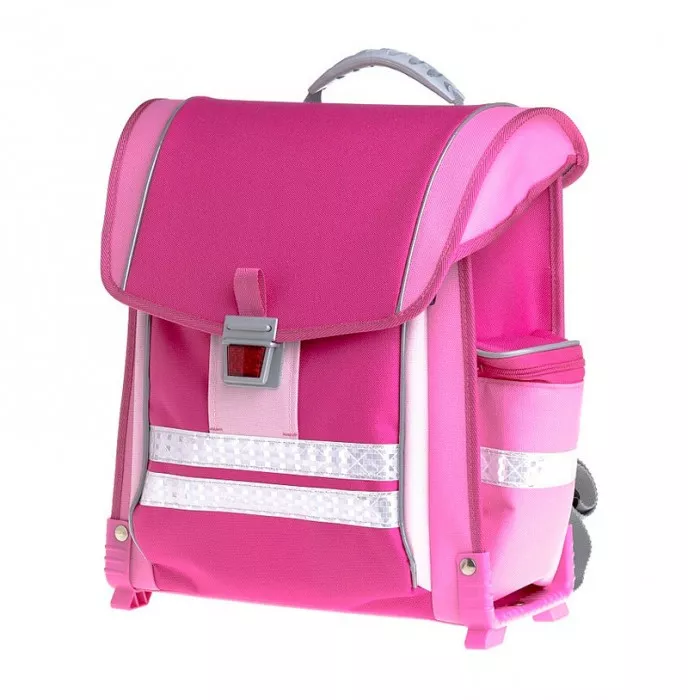 - Na předním dílu je našita plastová kapsička s týdenním rozvrhem hodin a jmenovkou, dále velká kapsa o rozměru š.230 x h.50 x v.270mm. Její horní část se uzavírá pomocí popruhu se suchým zipem. Přes celou šířku přední kapsy jsou našity dva bezpečnostní reflexní pásky a přes obě boční kapsy jeden.