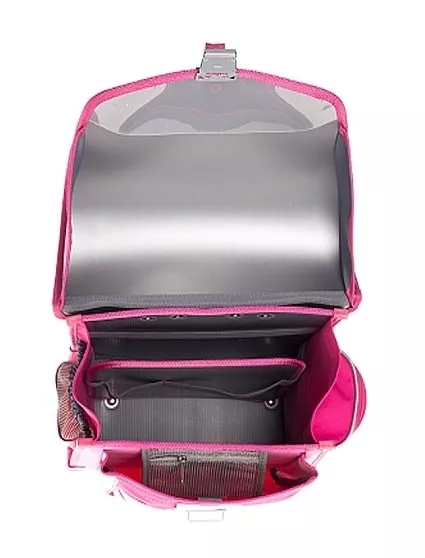 - Školní aktovka je uzavřena prostorově tvarovanou klopnou přes celý svůj obvod, včetně přední kapsy. Tím je chráněn obsah aktovky před znehodnocením při deštivém počasí. Klopna je zajištěna proti otevření plastovou sponou (tzv. trojzubcem), která má možnost stáhnutí klopny dle potřeby žáka.