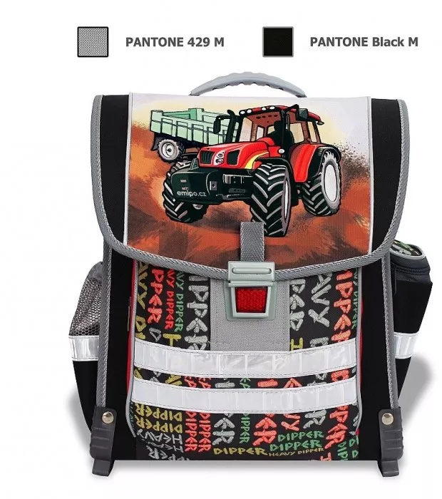 Školní aktovka EMIPO Traktor. Vnitřní část školní aktovky je členěna pohyblivou přepážkou na dvě části. Její plynule měnitelnou polohu umožňuje šlová pruženka. Tím je zajištěna větší variabilita pro vnitřní uspořádání jednotlivých školních pomůcek (sešitů, knih apod.) podle individuální potřeby ...