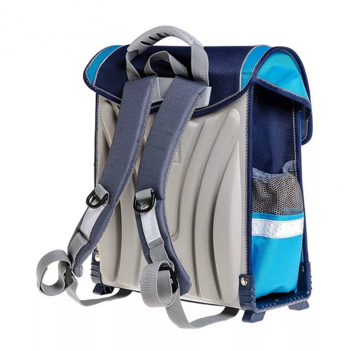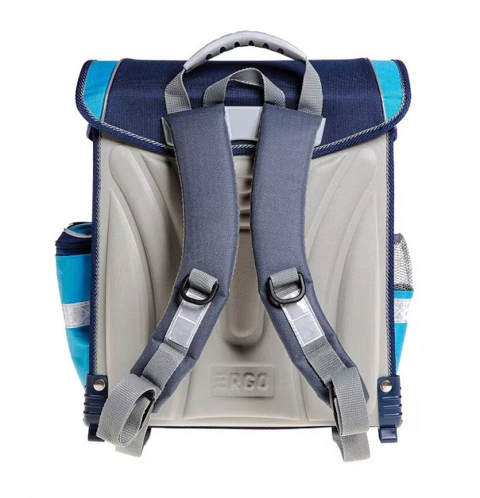 - Zadní část aktovky je opatřena nově vyvinutými anatomicky tvarovanými zády ERGO vyrobenými z gumové pěny na povrchu potažené bavlněnou textilií. Jejich tuhost je nastavena tak, aby se jednak neprotláčel obsah do zad školáka a také aby tzv. seděla na zádech a držela správnou polohu páteře.