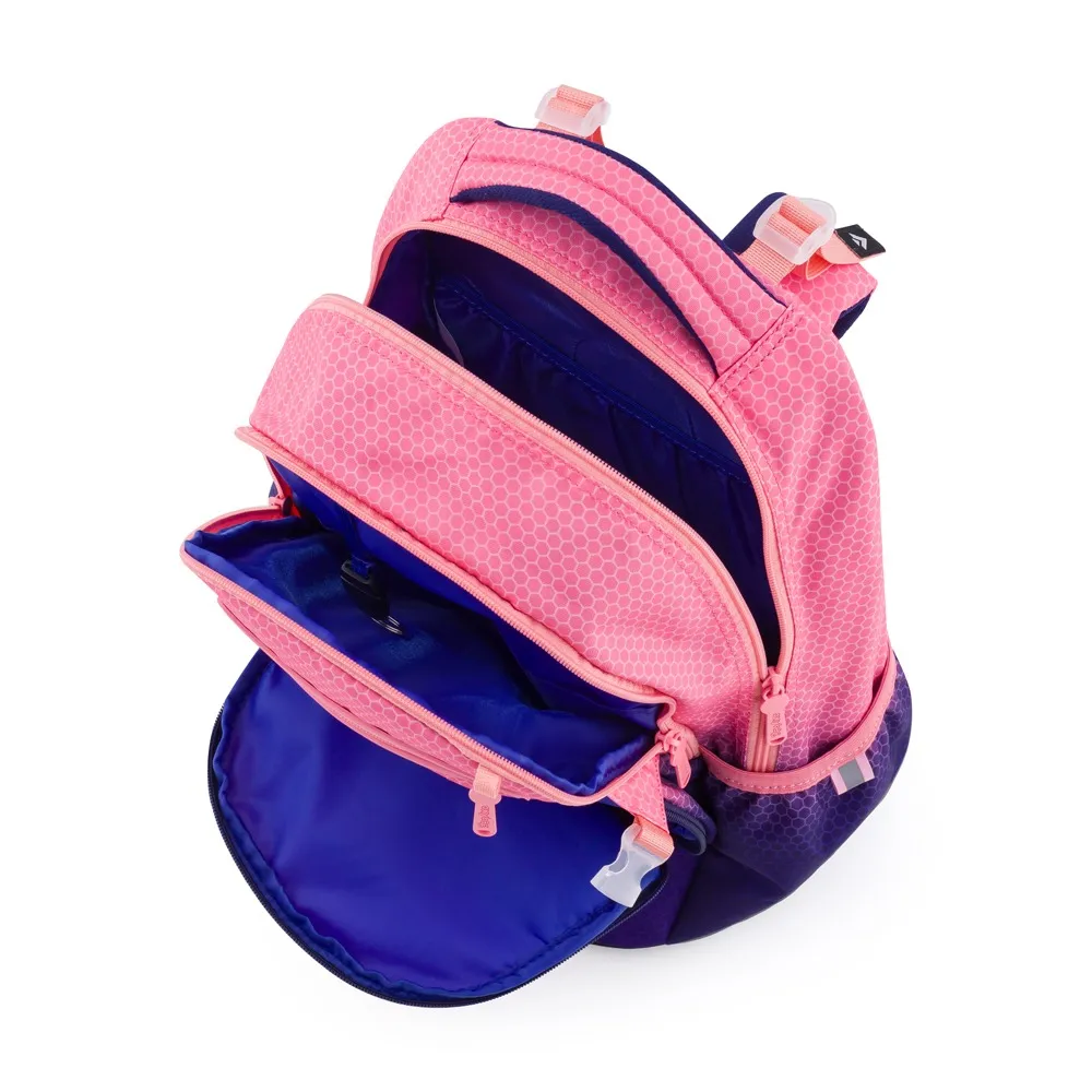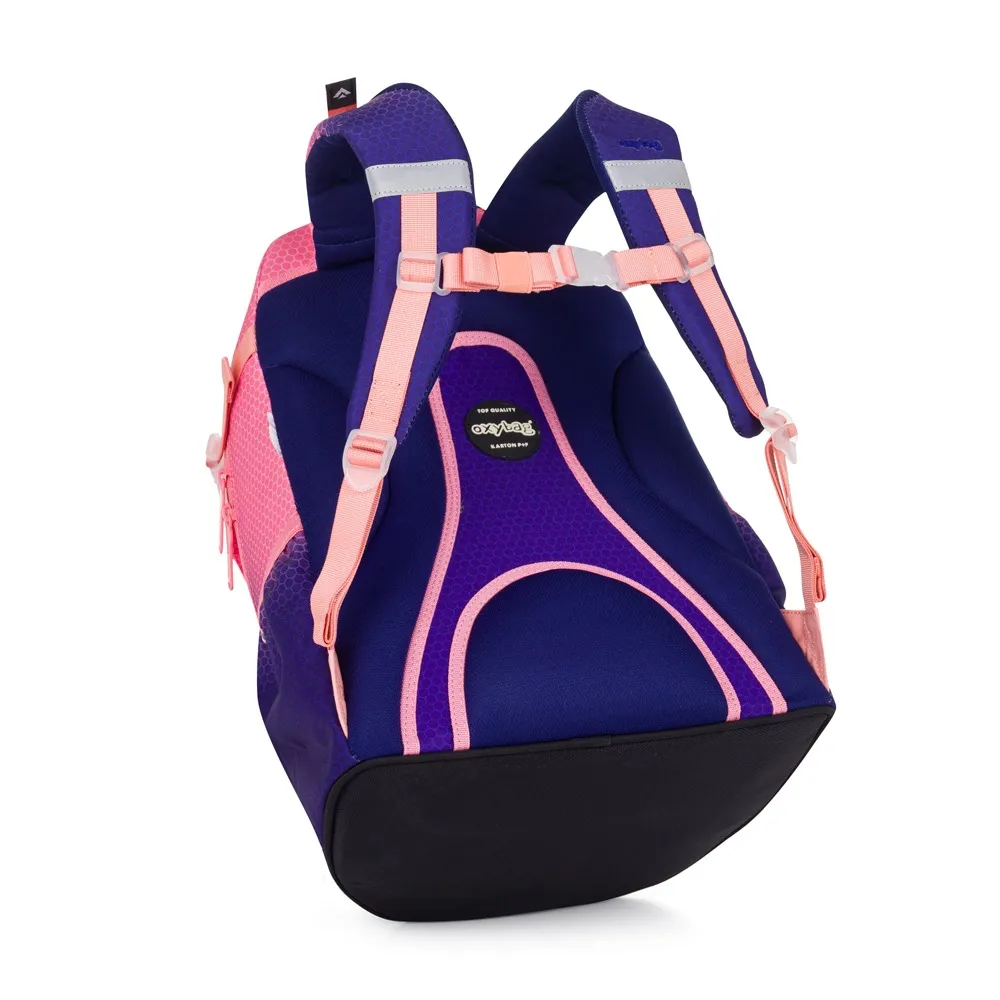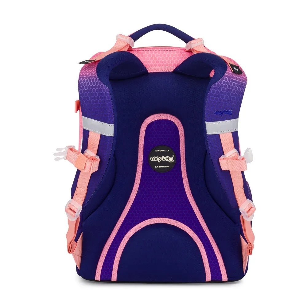 Školní batoh z řady OXY Ombre je ideální pro školáky od 3. třídy. Moderní design ve stylu ombre zaujme na první pohled. Anatomicky tvarovaný zádový panel, polstrované ramenní popruhy a nastavitelný hrudní popruh zajistí záda jako v bavlnce každému školákovi. Pevné dno zabraňuje převrhnutí samostatně stojícího batohu. Batoh disponuje dvěma prostornými kapsami na všechny potřebné školní pomůcky. V bočních postranních kapsách na gumu je prostor pro láhev na pití, která je snadno dostupná pro doplnění pitného režimu každého školáka. Do přední kapsičky se snadno schová menší svačina. Nechybí řada reflexních prvků. Batoh je vhodný pro děti vysoké od 136 cm. Délka zádového panelu je 43 cm, objem činí 28 l, hmotnost batohu je 960 g a jeho nosnost je 8 kg.