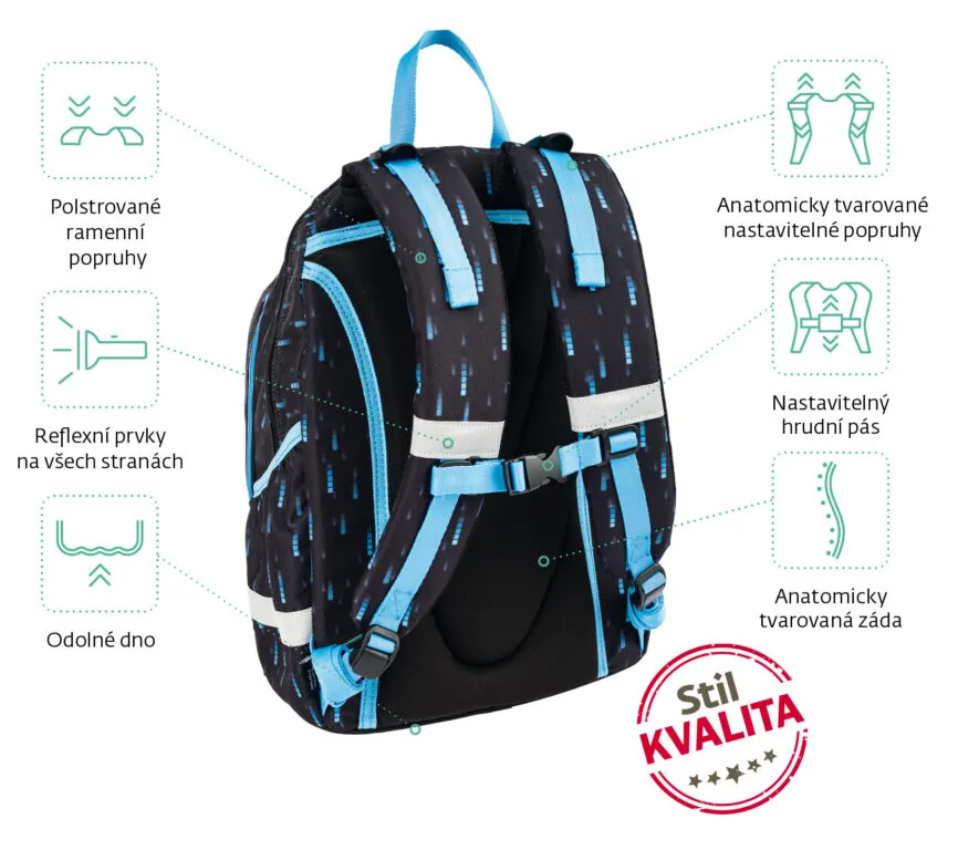 Kvalitní anatomicky tvarovaný batoh vhodný od 3. třídyAnatomicky tvarovaná polstrovaná záda z prodyšného materiálu s air systémem2 komory na formát A4 a menší přední kapsy na svačinu, penál a drobnostiV zadní komoře kapsa na notebookPolstrované ramenní popruhyPolstrované uchoNastavitelný hrudní popruhVodoodpudivý materiálZpevněné dnoReflexní prvkyRozměry: výška 43 cm, šířka 33 cm, hloubka 21 cmHmotnost: cca 1,1 kgNosnost: 10 kgObjem: 28 lKvalitní anatomicky tvarovaný batoh vhodný od 3. třídyAnatomicky tvarovaná polstrovaná záda z prodyšného materiálu s air systémem2 komory na formát A4 a menší přední kapsy na svačinu, penál a drobnostiV zadní komoře kapsa na notebookPolstrované ramenní popruhyPolstrované uchoNastavitelný hrudní popruhVodoodpudivý materiálZpevněné dnoReflexní prvkyRozměry: výška 43 cm, šířka 33 cm, hloubka 21 cmHmotnost: cca 1,1 kgNosnost: 10 kgObjem: 28 l