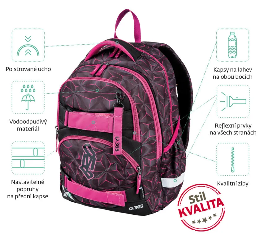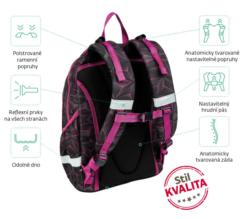 Kvalitní anatomicky tvarovaný batoh vhodný od 3. třídyAnatomicky tvarovaná polstrovaná záda z prodyšného materiálu s air systémem2 komory na formát A4 a menší přední kapsy na svačinu, penál a drobnostiV zadní komoře kapsa na notebookPolstrované ramenní popruhyPolstrované uchoNastavitelný hrudní popruhVodoodpudivý materiálZpevněné dnoReflexní prvkyRozměry: výška 43 cm, šířka 33 cm, hloubka 21 cmHmotnost: cca 1,1 kgNosnost: 10 kgObjem: 28 lKvalitní anatomicky tvarovaný batoh vhodný od 3. třídyAnatomicky tvarovaná polstrovaná záda z prodyšného materiálu s air systémem2 komory na formát A4 a menší přední kapsy na svačinu, penál a drobnostiV zadní komoře kapsa na notebookPolstrované ramenní popruhyPolstrované uchoNastavitelný hrudní popruhVodoodpudivý materiálZpevněné dnoReflexní prvkyRozměry: výška 43 cm, šířka 33 cm, hloubka 21 cmHmotnost: cca 1,1 kgNosnost: 10 kgObjem: 28 l