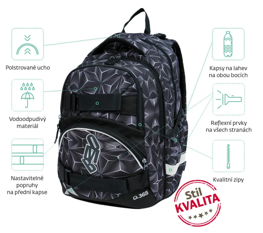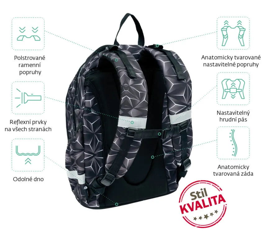 Kvalitní anatomicky tvarovaný batoh vhodný od 3. třídyAnatomicky tvarovaná polstrovaná záda z prodyšného materiálu s air systémem2 komory na formát A4 a menší přední kapsy na svačinu, penál a drobnostiV zadní komoře kapsa na notebookPolstrované ramenní popruhyPolstrované uchoNastavitelný hrudní popruhVodoodpudivý materiálZpevněné dnoReflexní prvkyRozměry: výška 43 cm, šířka 33 cm, hloubka 21 cmHmotnost: cca 1,1 kgNosnost: 10 kgObjem: 28 lKvalitní anatomicky tvarovaný batoh vhodný od 3. třídyAnatomicky tvarovaná polstrovaná záda z prodyšného materiálu s air systémem2 komory na formát A4 a menší přední kapsy na svačinu, penál a drobnostiV zadní komoře kapsa na notebookPolstrované ramenní popruhyPolstrované uchoNastavitelný hrudní popruhVodoodpudivý materiálZpevněné dnoReflexní prvkyRozměry: výška 43 cm, šířka 33 cm, hloubka 21 cmHmotnost: cca 1,1 kgNosnost: 10 kgObjem: 28 l