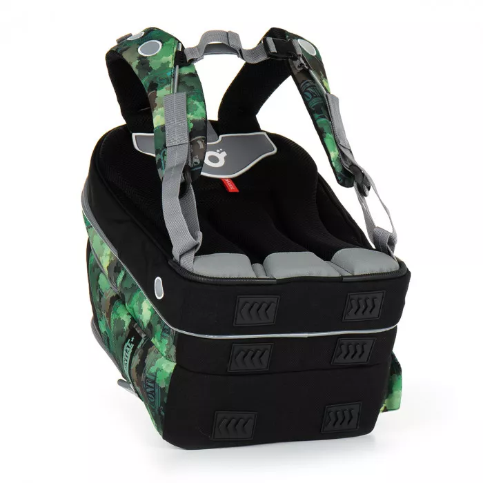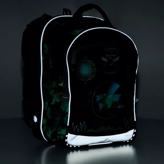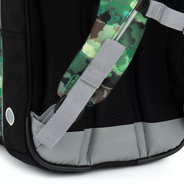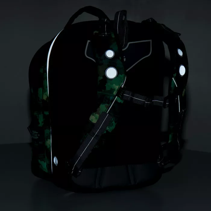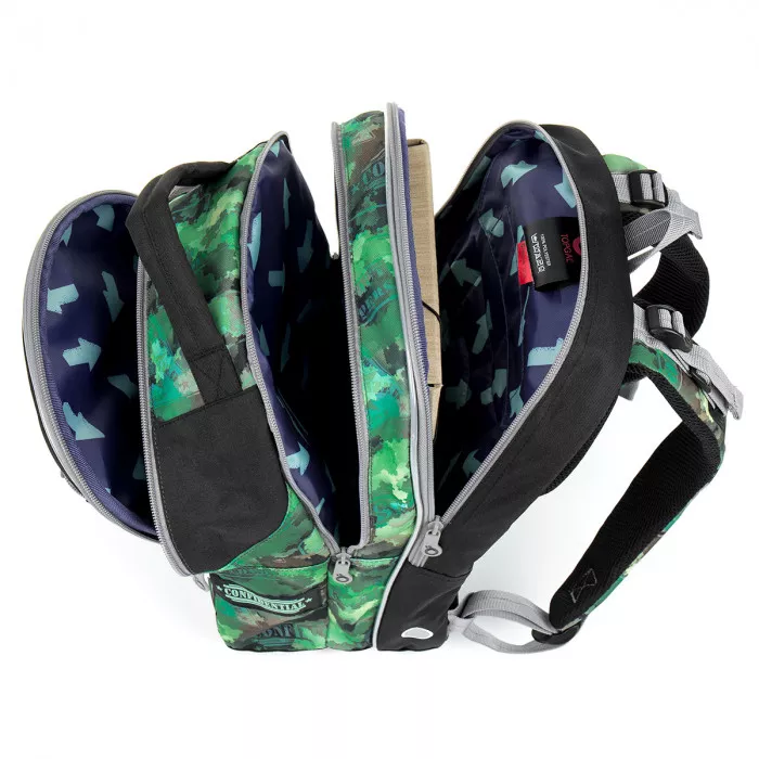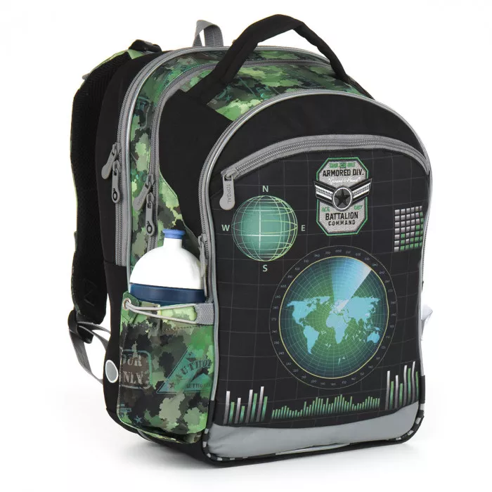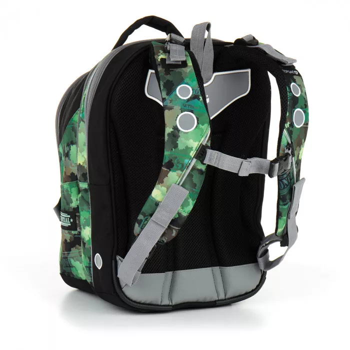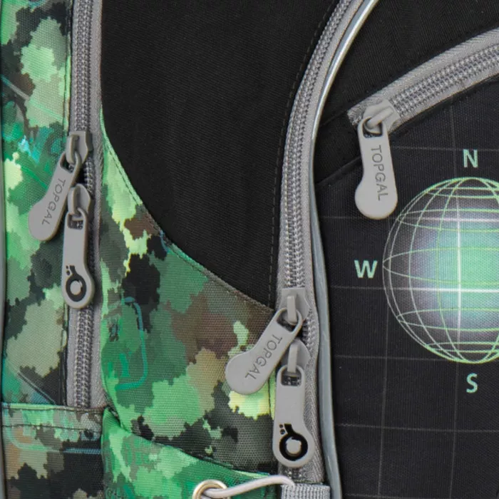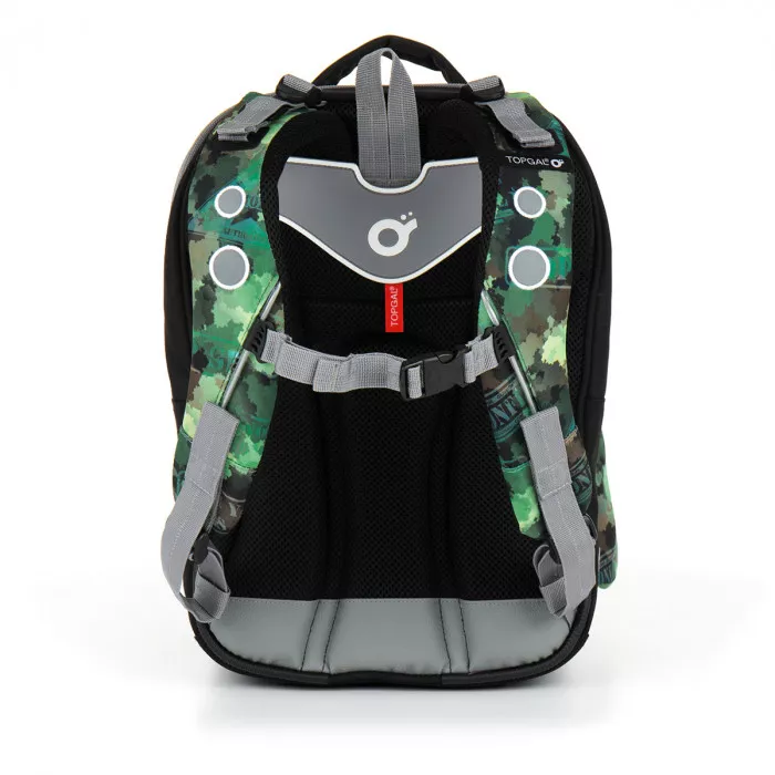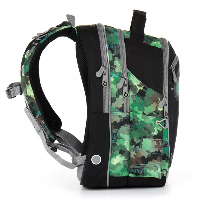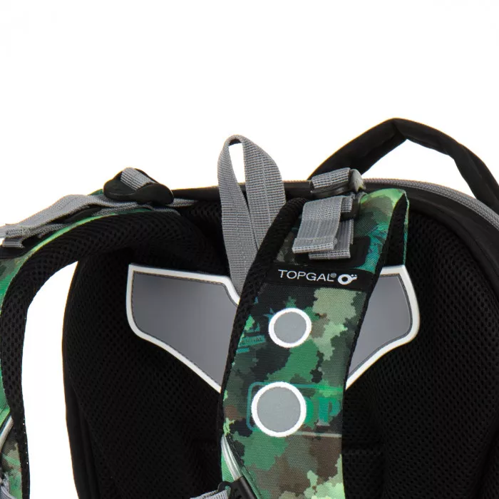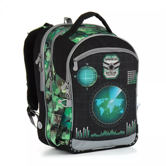 Školní batoh Topgal CHI 883 E - Green. Školní tříkomorový batoh pro malého špióna velikostně vhodné od 1. do 5. třídy tříkomorová stálice s pevnými zády a hliníkovou výztuhou nastavitelné ramenní popruhy s hrudním páskem Tříkomorový maskáčový model pro malé objevitele od 1. třídy. Velikostně bude vyhovovat určitě až do 5. třídy. Všechny jeho komory pojmou veškeré učivo a další drobnosti potřebné při každodenní školní docházce. K zádům doporučujeme dávat ty nejtěžší knížky a desky se sešity. Přední komoru jsme opatřili síťovou kapsou na zip určenou na všechny drobnosti, které je nutné mít po ruce. Navíc zde najdete i odnímatelnou karabinku na klíče. Prostorná přední kapsa s motivem radaru klidně poslouží na umístění penálu nebo krabičky na svačinku. Najdete v ní i praktickou jmenovku. Na bok batohu pak umístíte lahvičku na pití. Reflexní prvky jsou u našich batohů samozřejmostí a najdete je na všech stranách batohu i na ramenních popruzích. Další vychytávky: poutko na zavěšení na lavici poutko na přenášení batohu v ruce zesílené dno z materiálu Topdura – pevné a nepropustné plastové nožičky Batoh můžete koupit buď samostatně, nebo ve zvýhodněných setech s penálem, s penálem a pytlíkem na přezůvky, penálem, pytlíkem na přezůvky a pláštěnkou na batoh. Samostatně se penál prodává pod označením CHI 919 E.