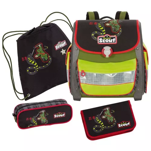 Školní set Scout 4-dílný, s motivem Ninjy a hada, obsahuje nejbezpečnější školní aktovku Buddy, sáček na cvičky, penál s prvotřídní náplní tužek a pastelek značky Staedtler a penál bez náplně.