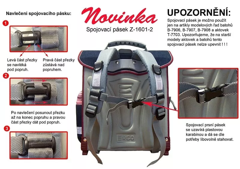 UPOZORNĚNÍ: Spojovací pásek je možno použít jen na artikly modelových řad batohů B-7908, B-7909, B-8020 a aktovek T-7705, T-7706 a T-8010. Upozorňujeme, že na starší modely aktovek a batohů tento spojovací pásek nejde upevnit!