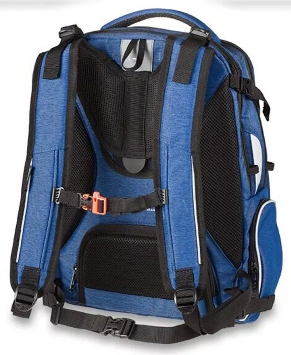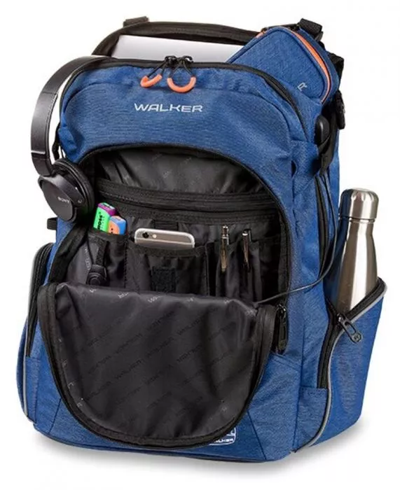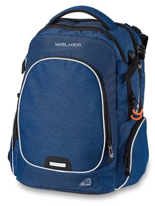 Studentský batoh CAMPUS EVO Navy Melange. Studentský batoh WALKER CAMPUS EVO patří ke špičce ve své kategorii. Je dvoukomorový s velkou přední kapsou na zip. Kapsa má uvnitř přes celou šířku velkou kapsu na zip, na které je našitý bohatě členěný organizér, který se skládá ze dvou kapsiček a několika přihrádek na psací potřeby. Na jedné kapsičce je odnímatelná spona s kroužkem na klíče a druhá je uzavíratelná suchým zipem. Zadní velká komora je z obou stran polstrovaná. Na zadní stěně je vyztužená přihrádka pro uložení notebook velikosti 15" a na ní je našitá jednoduchá otevřená kapsa na suchý zip pro uložení tabletu. Prostřední komora má v horní části kapsičku na mobil nebo power banku. Součástí je i kabel s USB konektorem, který vyúsťuje v USB port na vnější straně středového věnce. V horní části tohoto věnce je široké pevné polstrované madlo. Velikost obou komor lze regulovat bočními kompresními popruhy. Po obou bocích batohu jsou kapsičky na zip. Jedna je jednoduchá, ve druhé je síťka s košíkem na uložení lahve na pití. Batoh má bohatě polstrovaná anatomicky tvarovaná záda. Nosné řemeny jsou výškově stavitelné dle vzrůstu uživatele batohu. Nad nimi je ještě poutko na zavěšení batohu. Ve spodní části je bederní opěrka se skrytou kapsou na zip s RFID (radiofrekvenční) ochranou. Úplně dole se nachází nastavitelný bederní pásek pro lepší stabilitu batohu na zádech studenta. Nosné řemeny jsou silně polstrovány a na spojovacím pásku řemenů je umístěna píšťalka pro výstražný hvizd. Na řemenech, bočních částech středového věnce, lemu bočních kapes a i na obvodu přední kapsy jsou našity reflexní pásky nebo paspule. Dno je vyztuženo a zhotoveno z otěruvzdorného materiálu.