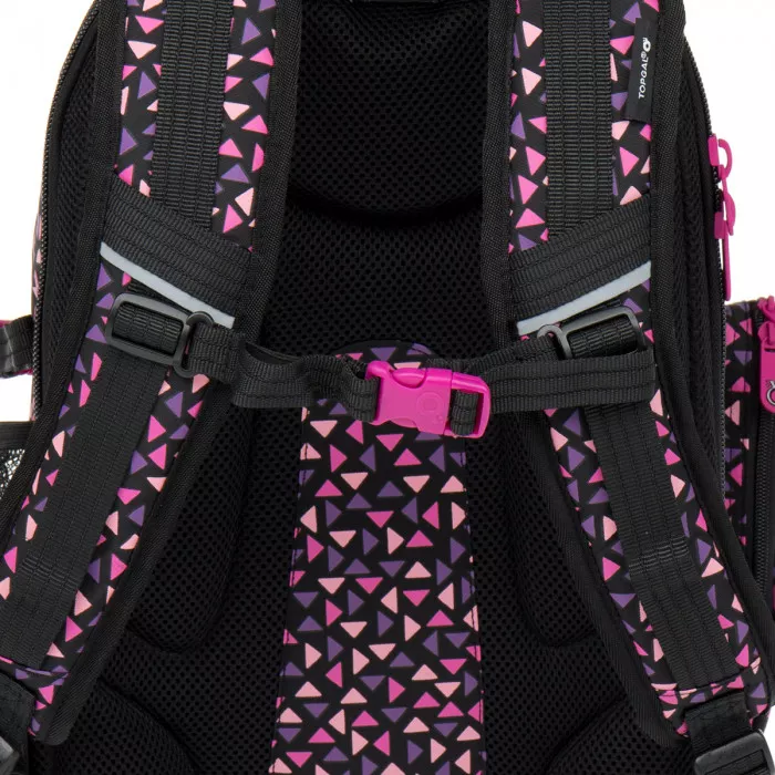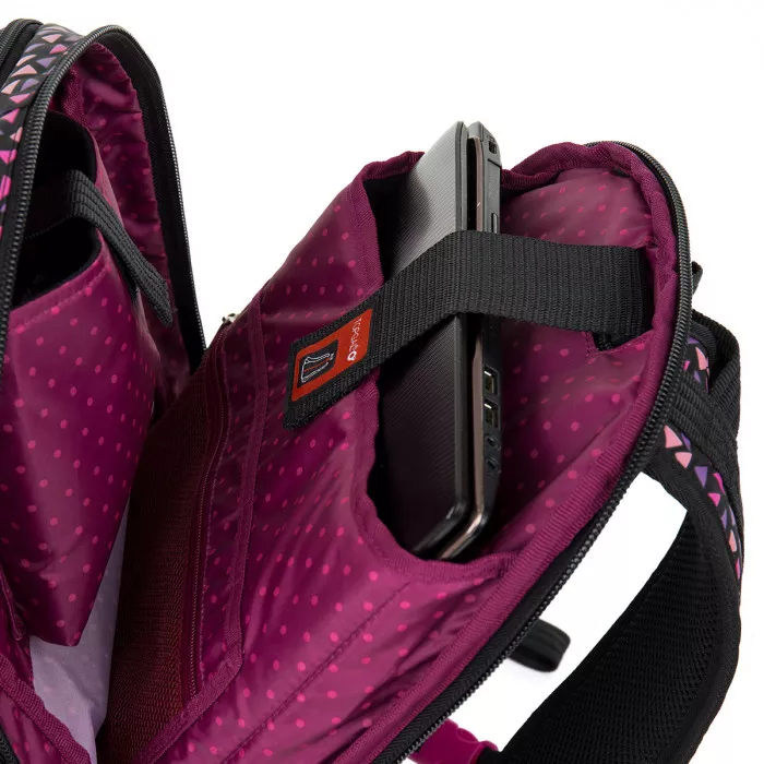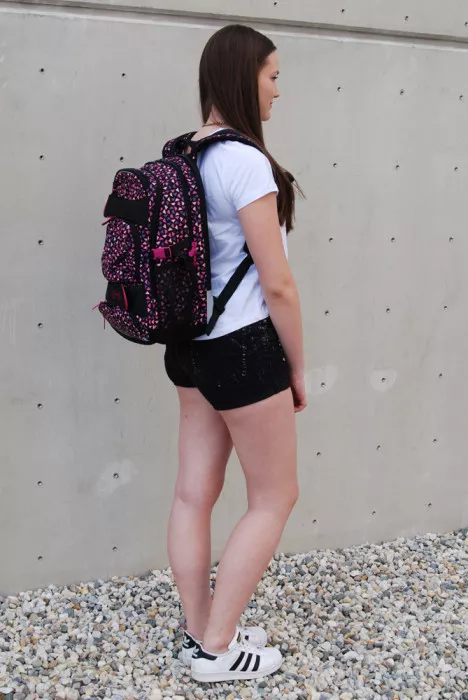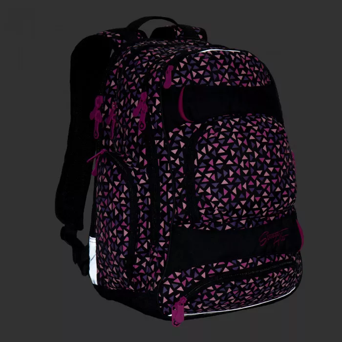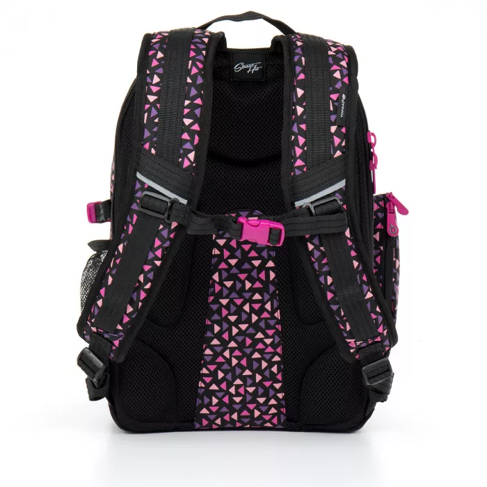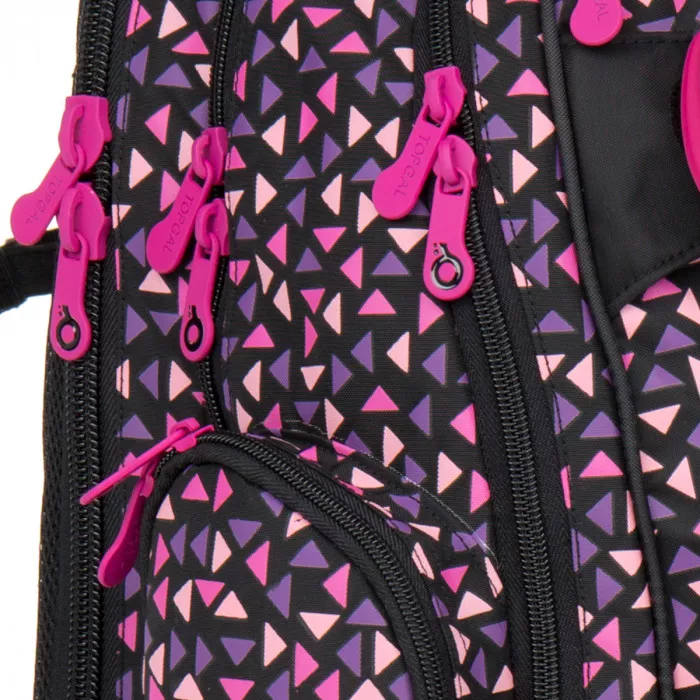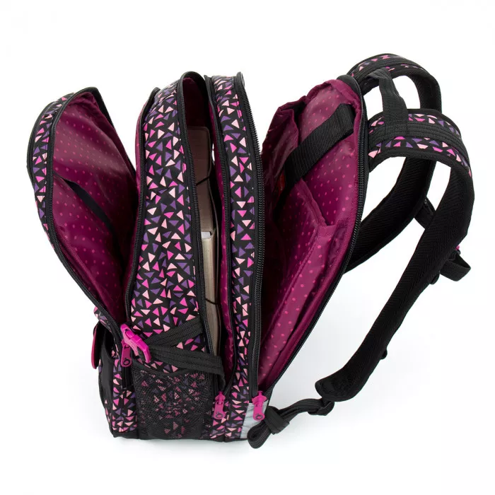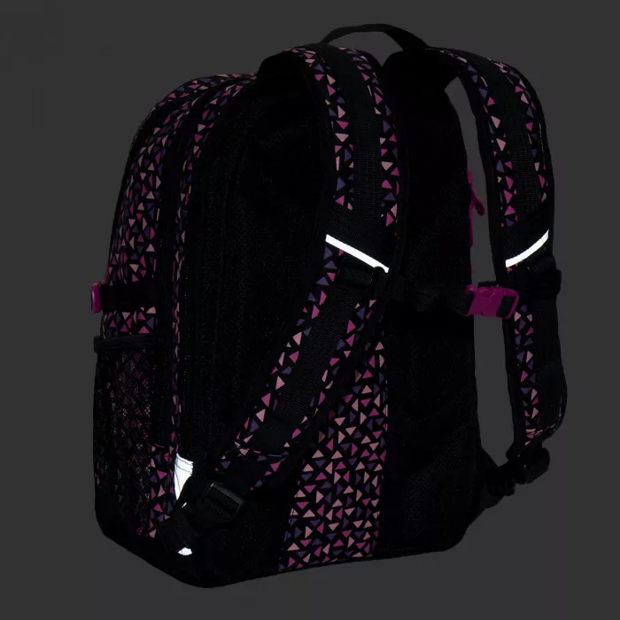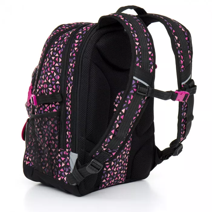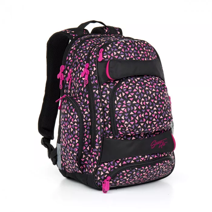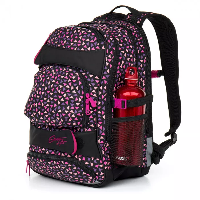 Studentský batoh Topgal HIT 862 H - Pink. Batoh studentské kolekce Street Hit velikost vhodná pro 2.stupeň ZŠ a SŠ pohodlné nastavitelné popruhy s kompresním hrudním páskem polstrovaný ergonomicky tvarovaný systém zad tři komory, tři přední kapsy, boční kapsa, kapsa na lahev Tříkomorový prostornější kámoš z rodinky Street Hitu - studentský batoh se třemi komorami, třemi předními a jednou boční kapsou. Mimo školu Ti skvěle poslouží i na sport a jiné příležitosti. Batoh má vychytanou vnitřní polstrovanou kapsu na notebook (do maximální velikosti displeje 15,4") nebo pouzdro s tabletem, které málokdy necháváš doma bez dozoru. Boční elastická kapsa s páskem je vhodná pro lahve o objemu až 1,5 l. Batoh má ergonomicky tvarované vyztužení zad s vyjímatelným hliníkovým pásem (což ocení spíš Tvoje máma, až ho bude cpát do pračky) a pohodlné široké popruhy. Ani u tohoto batohu nechybí designové popruhy na přední straně, ale na rozdíl od svého zeleného bráchy, je tento Streethiťák se svým jemným vzorem elegance sama. Vychytávky: dvě vnitřní kapsy na drobnosti (jedna polstrovaná), karabina na klíče polstrovaná kapsa na notebook (do maximální velikosti displeje 15,4") kvalitní pevné ucho pro přenášení v ruce kompresní hrudní pásek ramenních popruhů zajišťující rozložení váhy a pohodlné nošení odolné dno batohu z pevného materiálu TOPDURA (testováno v Institutu pro testování a certifikaci ve Zlíně) reflexní prvky