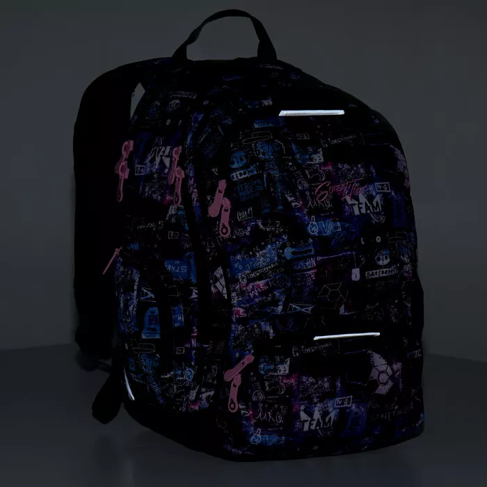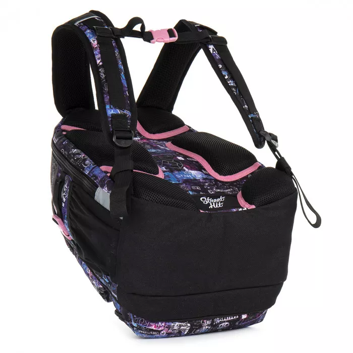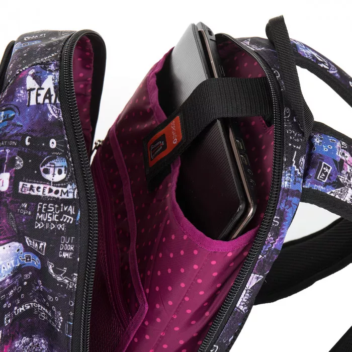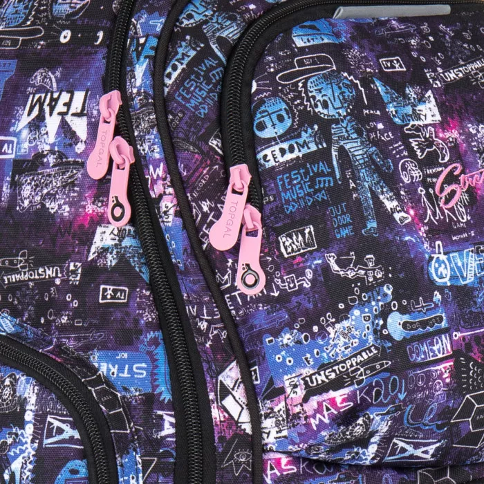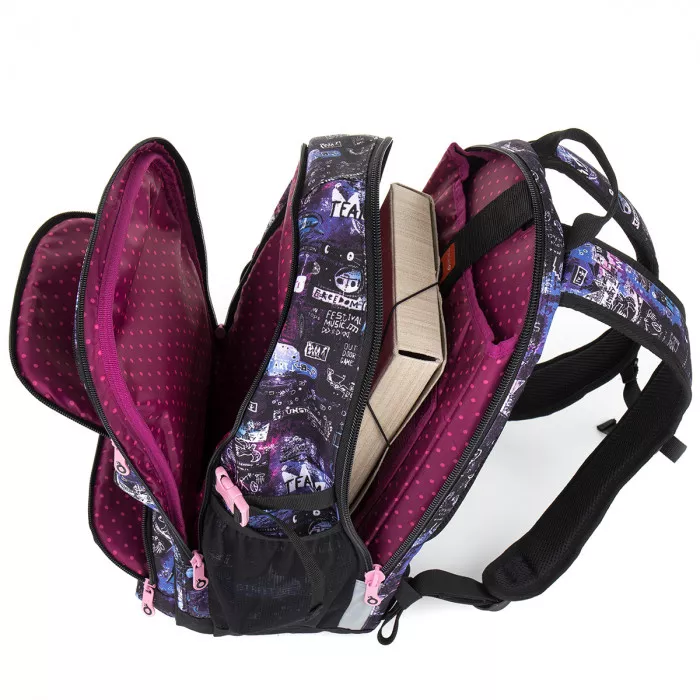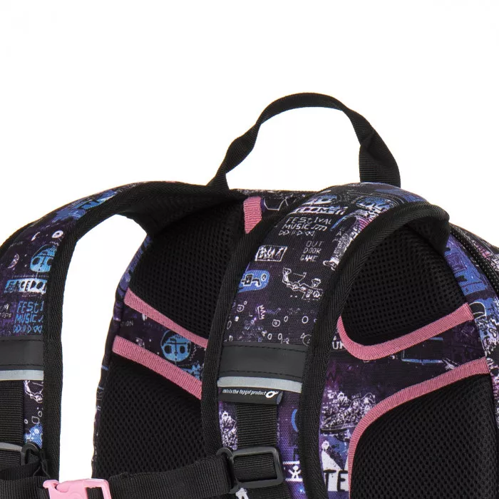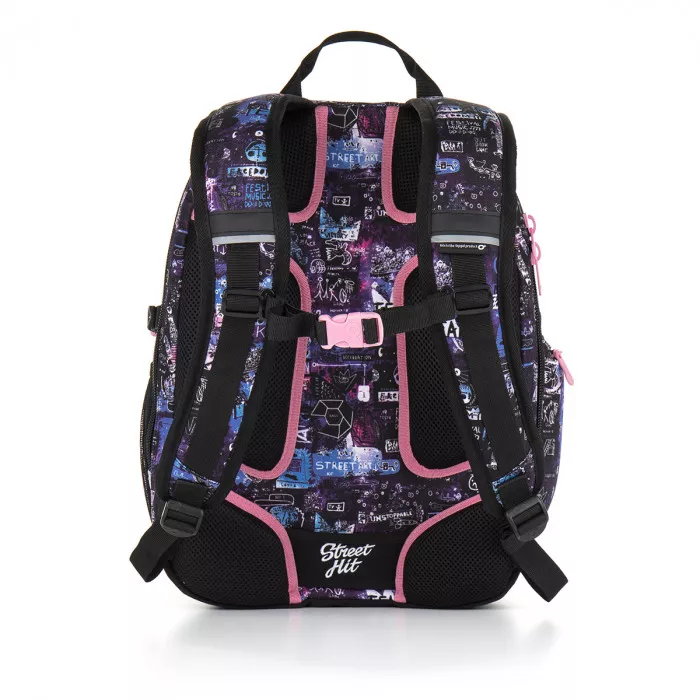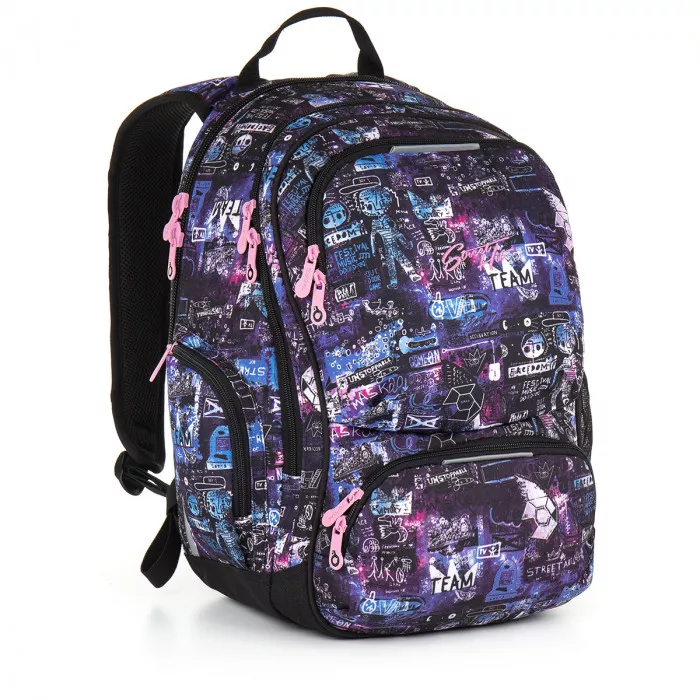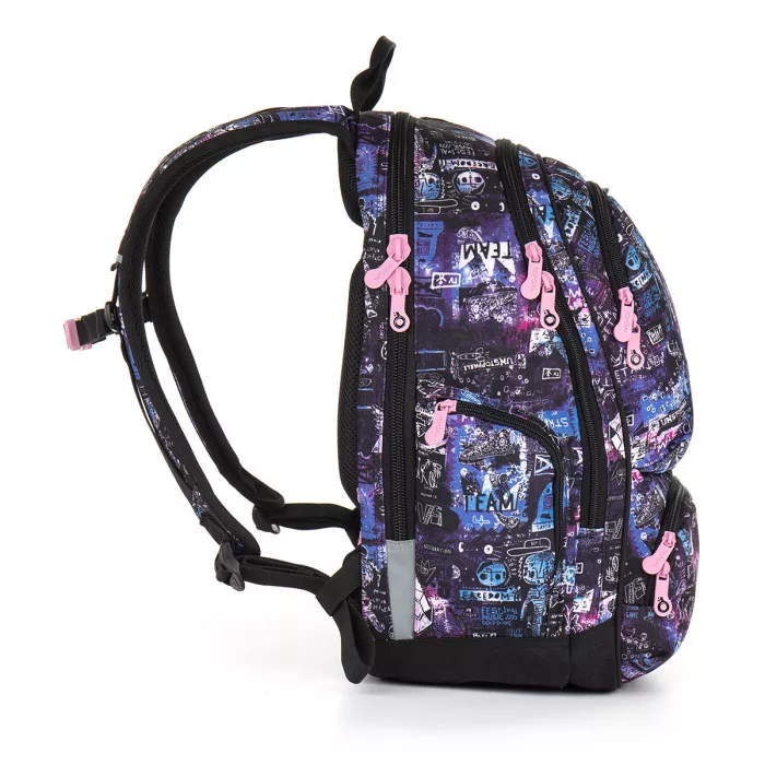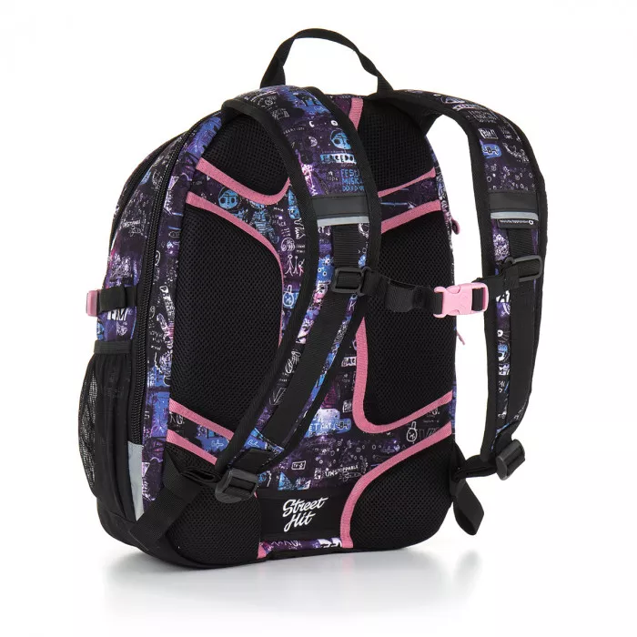 Studentský batoh Topgal HIT 889 I - Violet. Dívčí studentský dvoukomorový batoh ergonomicky tvarovaný zádový systém s pevným rámem polstrované a nastavitelné ramenní popruhy a hrudní pás Tenhle barevný kousek si zamilujete na první pohled. Svou velikostí vystačí nejen slečnám na 2. stupni základní školy, ale i středoškolačkám. Zadní komora batohu je nejobjemnější. Uvnitř ní čeká polstrovaná kapsa na notebook nebo tablet do maximální velikosti 15,4”. Skvělá je také malá síťová kapsa na zip určená pro všechny drobné potřebnosti. Do zadní komory se pohodlně vejdou i složky, těžké dokumenty nebo knihy. Přední komora je užší, určitě ji využiješ na další nezbytnosti, které musíš denně nosit na zádech do školy nebo do kroužků. Na přední části batohu jsou pak dvě menší praktické kapsičky, do kterých se pohodlně vejde svačina nebo penál. Bok batohu jsme vylepšili o síťovou kapsu pro lahev na pití s přezkou. Ta bude pevně držet i velkou lahev dokonce i při dobíhání na autobus. Na druhé straně je další menší praktická kapsička – třeba na brýle nebo kapesníčky.Ve stejném barevném provedení jako je batoh můžete zakoupit pouzdro/etui HIT 903, případně koupit celý zvýhodněný set batoh + penál. Další vychytávky: reflexní prvky kovové pogumované taháčky poutko pro přenášení v ruce dno batohu z pevného a nepropustného materiálu TOPDURA