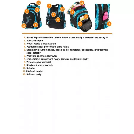 Studentský batoh WALKER FAME je dvoukomorový batoh s velkou přední kapsou uzavíranou na zip. Zadní komora má v horní části kapsičku na zip, na zadní části velkou otevřenou kapsu a vnitřní část je členěna zdvojenou přepážku, která tento prostor člení na tři samostatné části. Druhá komora je jednoduchá bez vnitřního členění. Přední velká kapsa má organizér navitý na kapse na zadní části. Organizér tvoří kapsička na mobil, síťovaná kapsička na zip a přihrádky na psací potřeby. V dolní části kapsy je reflexní paspule pro lepší viditelnost při špatných světelných podmínkách. Zádová část má ergonomické síťované polstrování. Široké nosné řemeny jsou opatřeny výškově nastavitelným spojovacím prsním páskem a reflexním páskem. V horní části je široké pevné madlo a vzadu pod ním poutko na pověšení. Po obou stranách jsou zdvojené kapsy s reflexní paspulí. Vnější menší kapsa je uzavíraná na zip, vnitřní větší je otevřená.