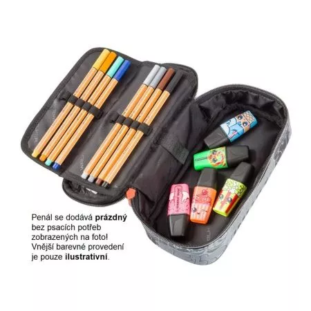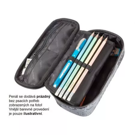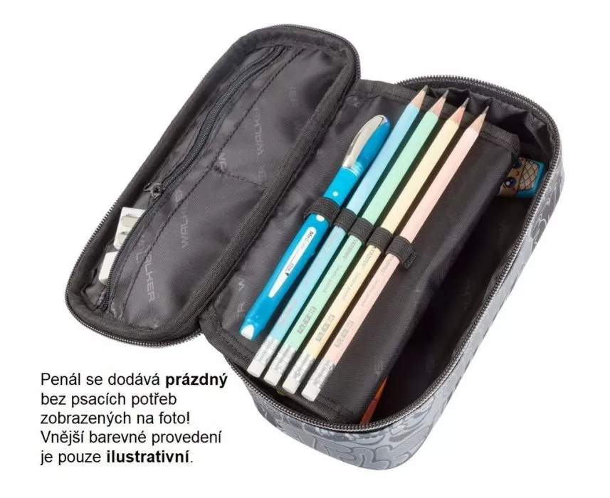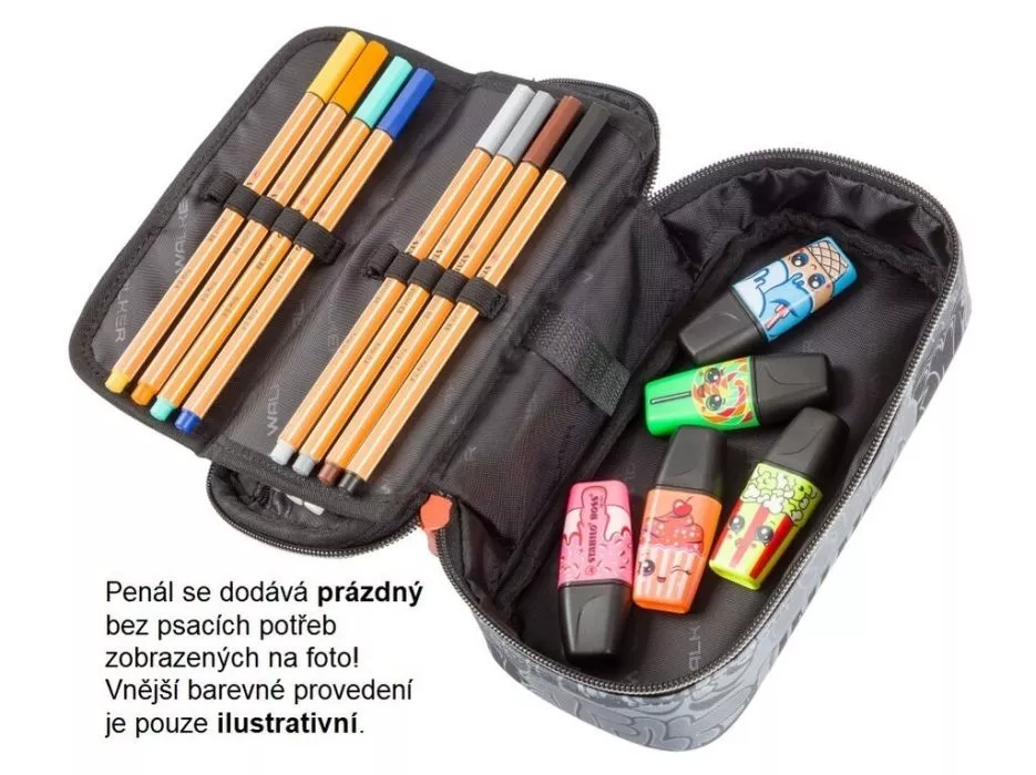 Studentský penál WIZZARD Grey. Kvalitní studentský penál WALKER CONCEPT je kombinací penálu, kde můžete ukládat psací potřeby do pruženkových úchytů a boxu, tam je můžete volně uložit. Na vnitřní části horní klopny je našita kapsa na zip. Pod ní jsou pak našity další dvě malé kapsičky. Na horní části je textilní nášivka s logem. Prostřední klopna je po rozlepení suchého zipu rozevíratelná. Na její horní i spodní straně je našito po deseti pruženkových poutek pro uložení psacích potřeb. Dolní část penálu pak složí jako box.