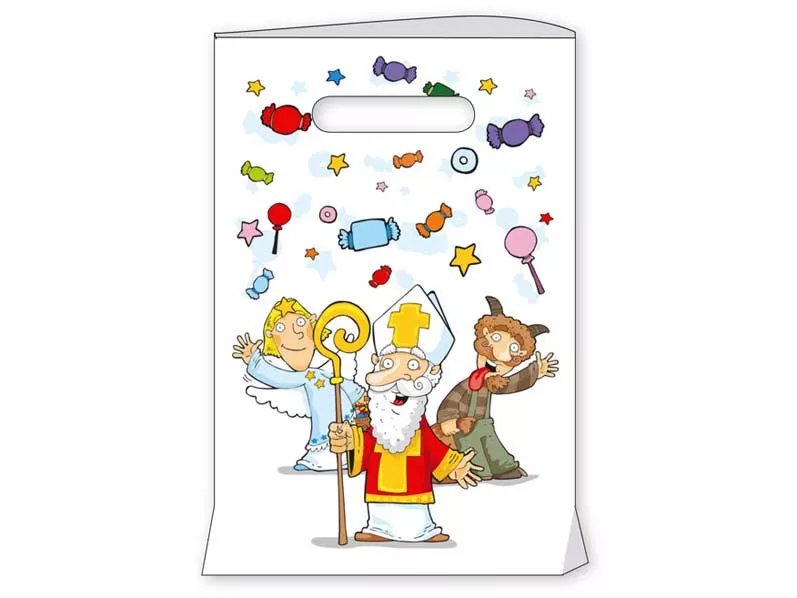 Taška Mikuláš MFP S vzor 6 20x30x8. Igelitová taška s průhmatem. Mikulašský motiv. Praktické balení - odtrhávací blok. Expediční balení 50kusů. Cena za kus.