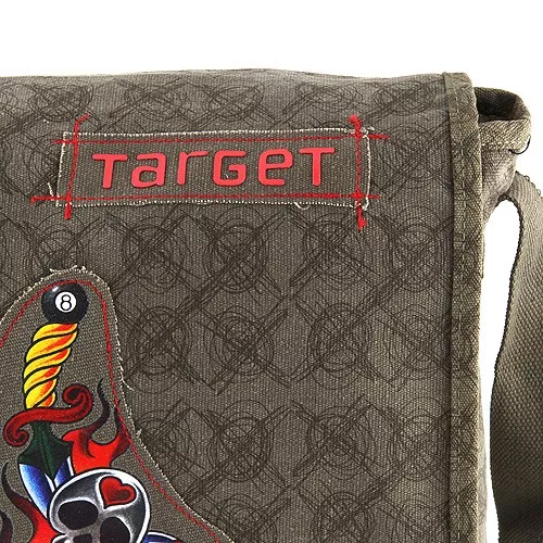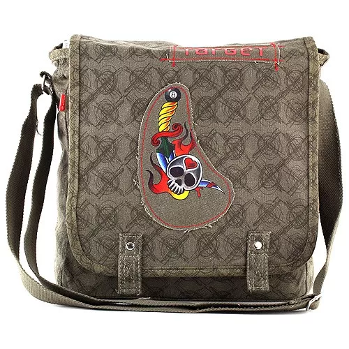 Plátěná taška přes rameno, s motivem Tattoo Johnny s nášivkou lebky a kulečníkové koule, od značky Target, v hnědo-zeleném provedení. Tento stylový a zároveň praktický pomocník na cesty i pro běžné nošení je vyroben z vysoce kvalitních materiálů zaručujících minimální opotřebení a dlouhou životnost.