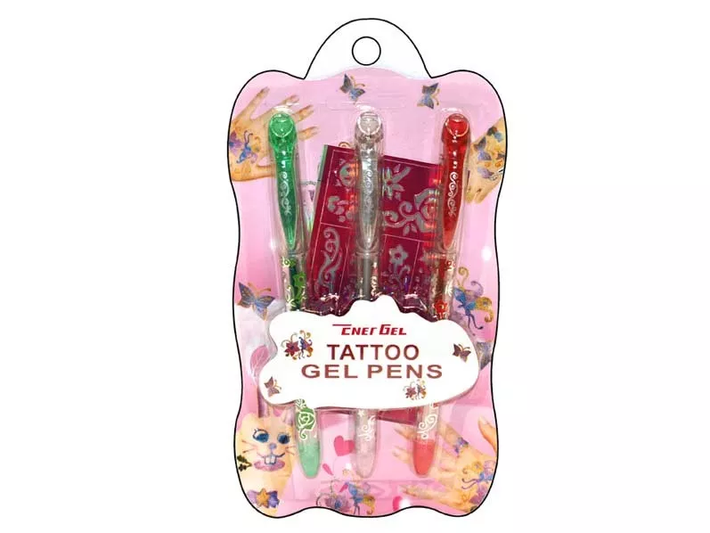 Tetovací pera WIKI 882475 gelová 3ks + šablona. Set tří kusů gelových tetovacích per. Barvy zelená, stříbrná, červená. Součástí balení je i šablona na obkreslení tetování. Tento výrobek je zdravotně nezávadný.