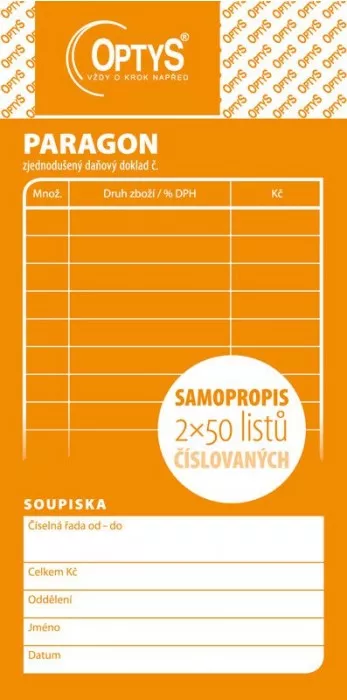 Tiskopis OPTYS, 1089 Obchodní paragon, samopropisovací číslovaný, 2x50 listů. Obchodní paragon - zjednodušený daňový doklad. Tiskopis je dle nové legislativy přizpůsoben pro 3. daň z přidané hodnoty, došlo tedy k rozšíření kolonek, samopropisovací, číslovaný, formát 7,5x15cm na výšku, obsahuje 2x50 listů odtržitelných perforací.
