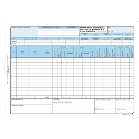 Tiskopis OPTYS, Záznam o době řízení vozidla a bezpeč. přestávkách Karbon A4, 100 listů. Takzvaná karbonová puťovka, propisovací přes karbonovou vrstru (podobné kopíráku), nečíslovaný, formát A4 na šířku, obsahuje 100 listů odtržitelných perforací, se zakládacím děrováním.