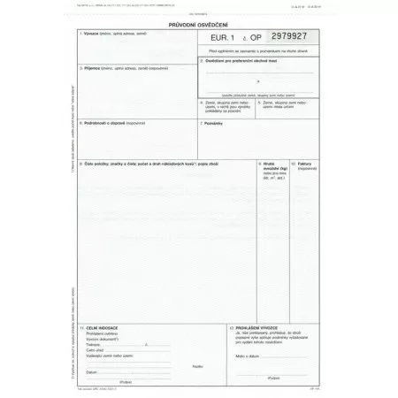 Tiskopis OPTYS, 1195 Průvodní osvědčení EUR 1 A4, očíslované, 1+2 listy. Nepropisující tiskopis, snap-out 1+2 listy, formát A4 + odtrhávací lišta.