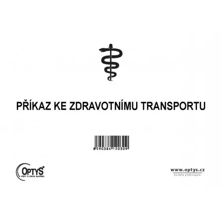 Tiskopis OPTYS, 1203 Příkaz ke zdravotnímu transportu A5, číslovaný, samopropisovací, 2x25 listů. Příkaz ke zdravotnímu transportu samopropisovací, číslovaný, formát A5 na šířku, obsahuje 2x25 listů bez perforace.