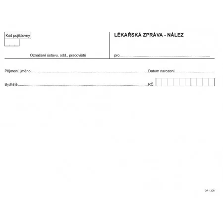 Tiskopis OPTYS 1208, Lékařská zpráva A5, nález, 50 listů. Lékařská zpráva - nález, nepropisovací, nečíslovaná, formát A5 na šířku, obsahuje 50 listů bez perforace.