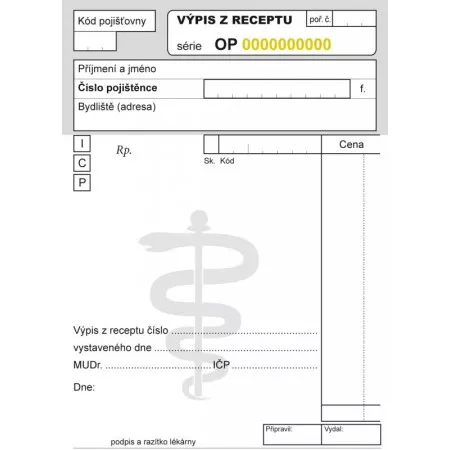 Tiskopis OPTYS, 1213 Výpis z receptu A6, číslovaný, 50 listů. Výpis z receptu, nepropisovací, číslovaný, formát A6 na výšku, obsahuje 50 listů bez perforace.