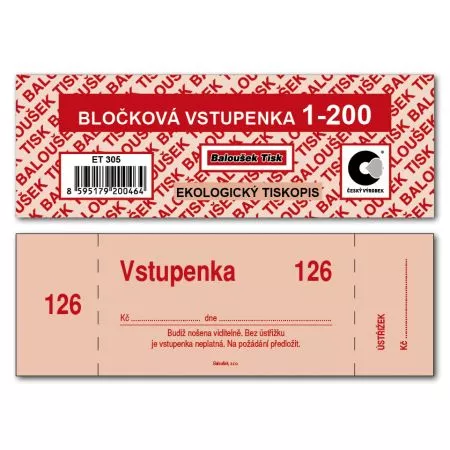 Bločkové vstupenky 1 - 200 čísel, ET305. Vyrobeno z recyklovaného papíru ve 4 barevných provedeních. Vnitřní listy s perforací pro snadné odtržení. Lepený blok.