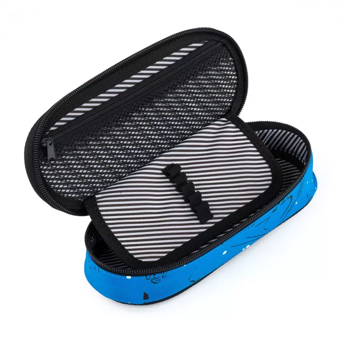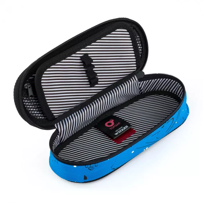 Topgal Studentské pouzdro ETUE 21033 B. Oválný penál pro všechny potřebnosti v moderním provedení. Pouzdro je polstrované, takže se tužky zaručeně nepolámou. Uvnitř pouzdra je síťová kapsička na zip a klopa, na níž jsou umístěny gumičky pro uchycení celkem devíti tužek a propisek, které je potřeba mít přehledně uspořádané a po ruce. Volný prostor pod klopou pak umožňuje volně umístit další psací potřeby – pastelky, fixy, prostě cokoliv potřebujete. Pouzdro je polstrované, takže se tužky zaručeně nepolámou. Zipy s velkými taháčky navíc umožní bezproblémovou manipulaci s pouzdrem.