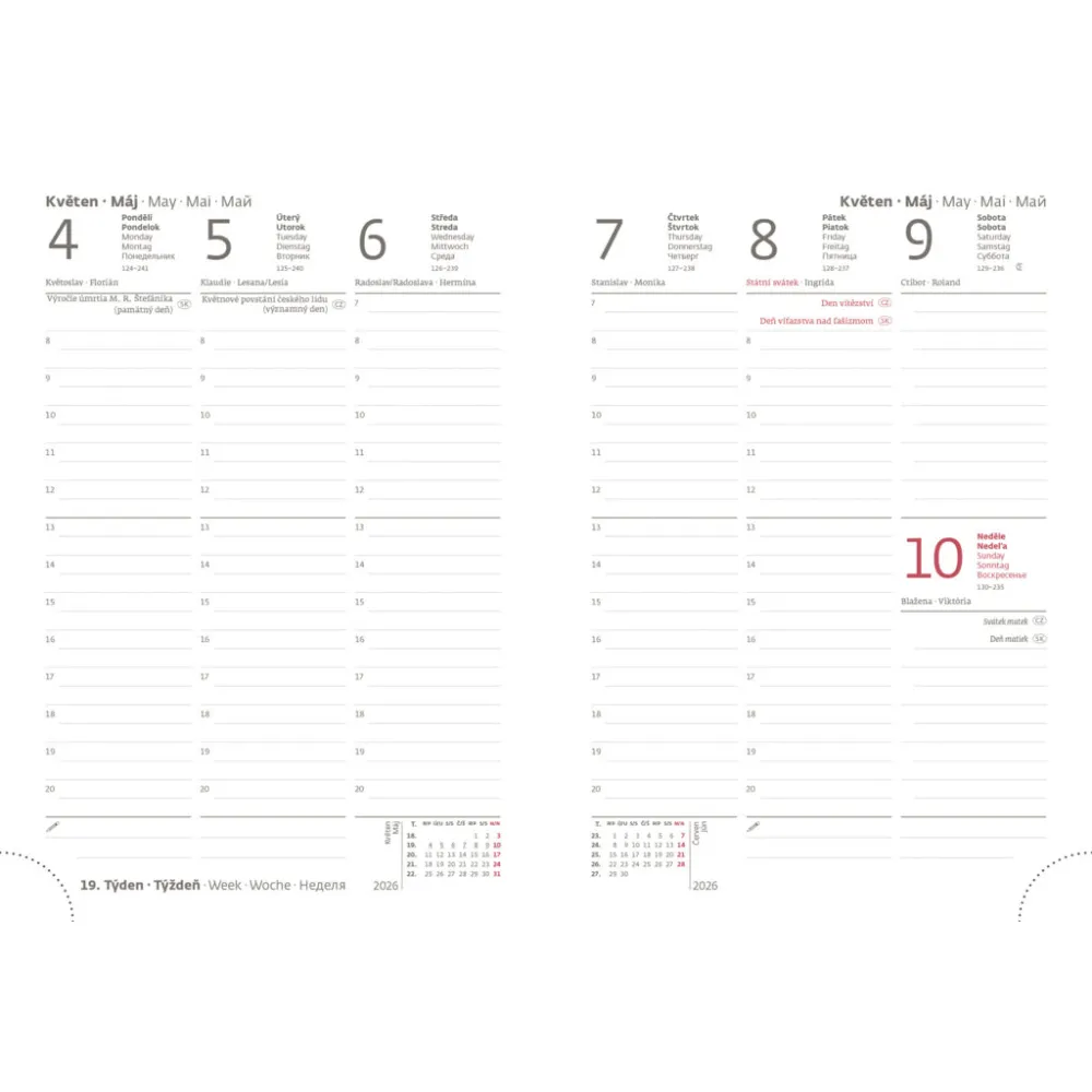 Diář obsahuje: osobní údaje, plánovač dovolené (měsíční přehled), plánovací kalendář, telefonní předvolby, státní svátky České a Slovenské republiky, mezinárodní svátky, roční výhled, týdenní layout, adresář, mapa Evropy a České a Slovenské republiky