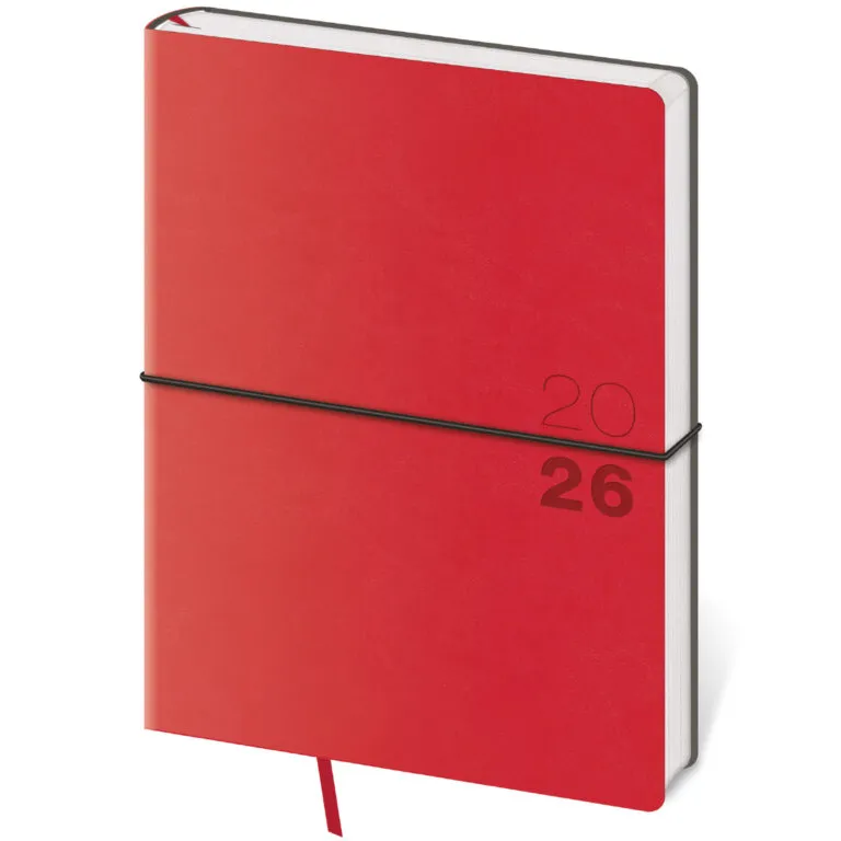 Moderní diář v měkké ohebné vazbě s kulatou příčnou gumičkou přes hřbet představuje nejnovější způsob zpracování. Diář je příjemný do ruky díky matné kožence a lehký díky měkkým deskám. Materiál desek se hodí na sleporažbu, která na kožence vynikne.