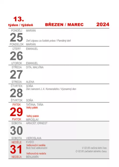 Formát kalendáře: 10 x 15 cm Kalendárium: české/slovenské týdenní jmenné Rozsah kalendáře: 56 + 1 listůFormát kalendáře: 10 x 15 cm Kalendárium: české/slovenské týdenní jmenné Rozsah kalendáře: 56 + 1 listů