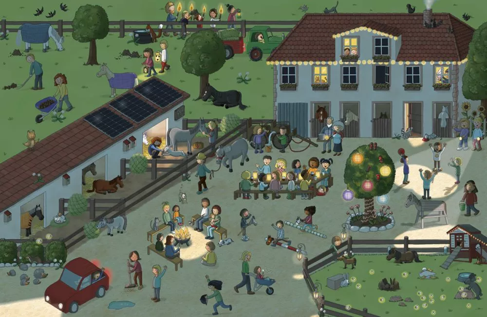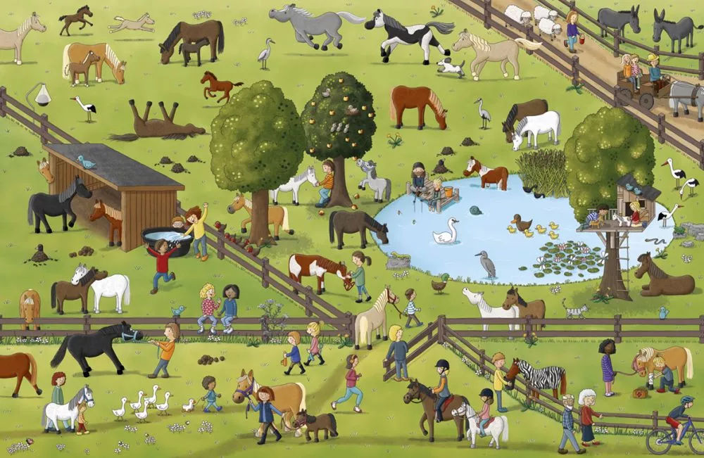 V téhle velké obrázkové knížce prožijete úžasný den mezi koni a poníky. Na velkoformátových ilustracích můžete tyto krásné a ušlechtilé tvory obdivovat. Nahlédnete do každodenního života na koňské farmě, vyrazíte na projížďku, budete fandit na dostizích nebo sledovat hřebce, klisny a hříbátka na pastvě. Poznáte, co všechno obnáší péče o tato zvířata, co mají ráda nebo při jakých činnostech mohou člověku pomáhat. Některé postavičky a zvířátka můžete hledat na každé dvojstránce znovu a znovu a sledovat jejich příběhy. Je to docela fuška, ale hlavně velká zábava!