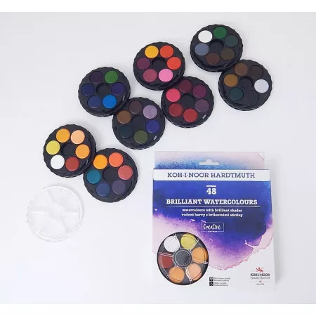 Vodové barvy Koh-i-noor 174507/4 brilantní ANILINKY 48 odstínů. Brilantní vodové barvy ANILINKY o průměru tablet 22,5 mm s 48ti odstíny. Mají jasné a syté barvy, jsou jistým ekvivalentem akvarelových barev. Vhodné pro speciální výtvarné techniky jako např. malbu portrétů, kolorování fotografií, malbu na dekorační ...